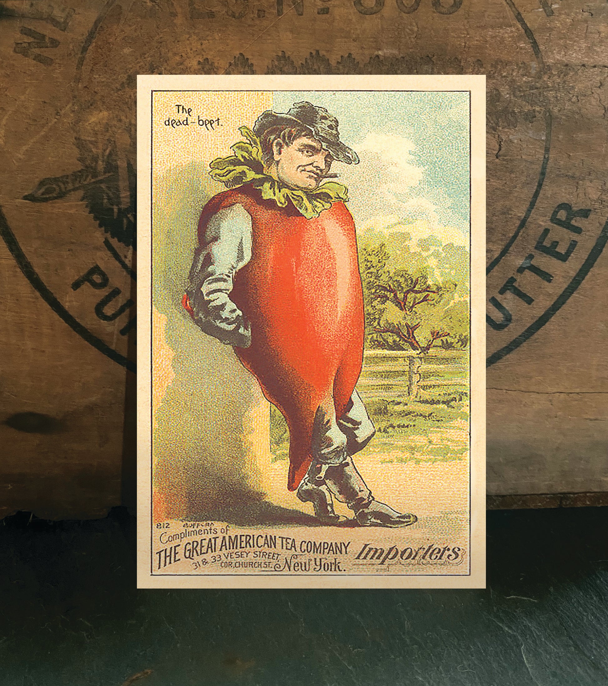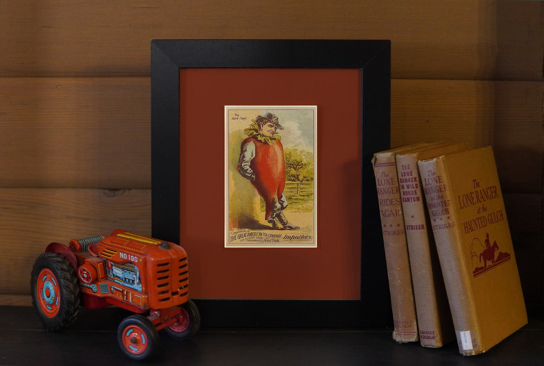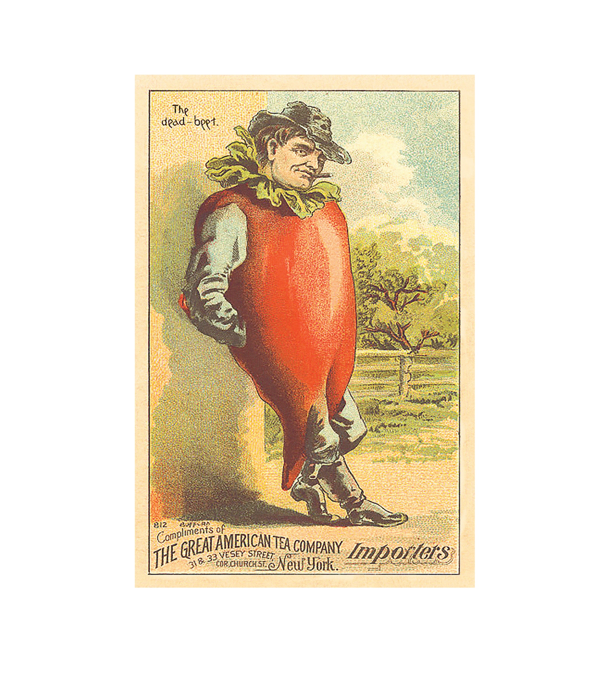 Trade cards were common in the 1800s, and often showed offbeat images that existed to build brand buzz. This is part of a collection we are working on of anthropomorphic vegetable people.