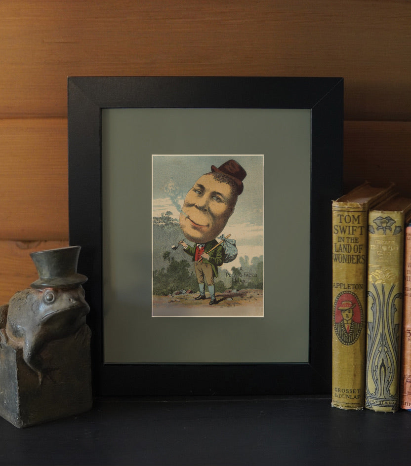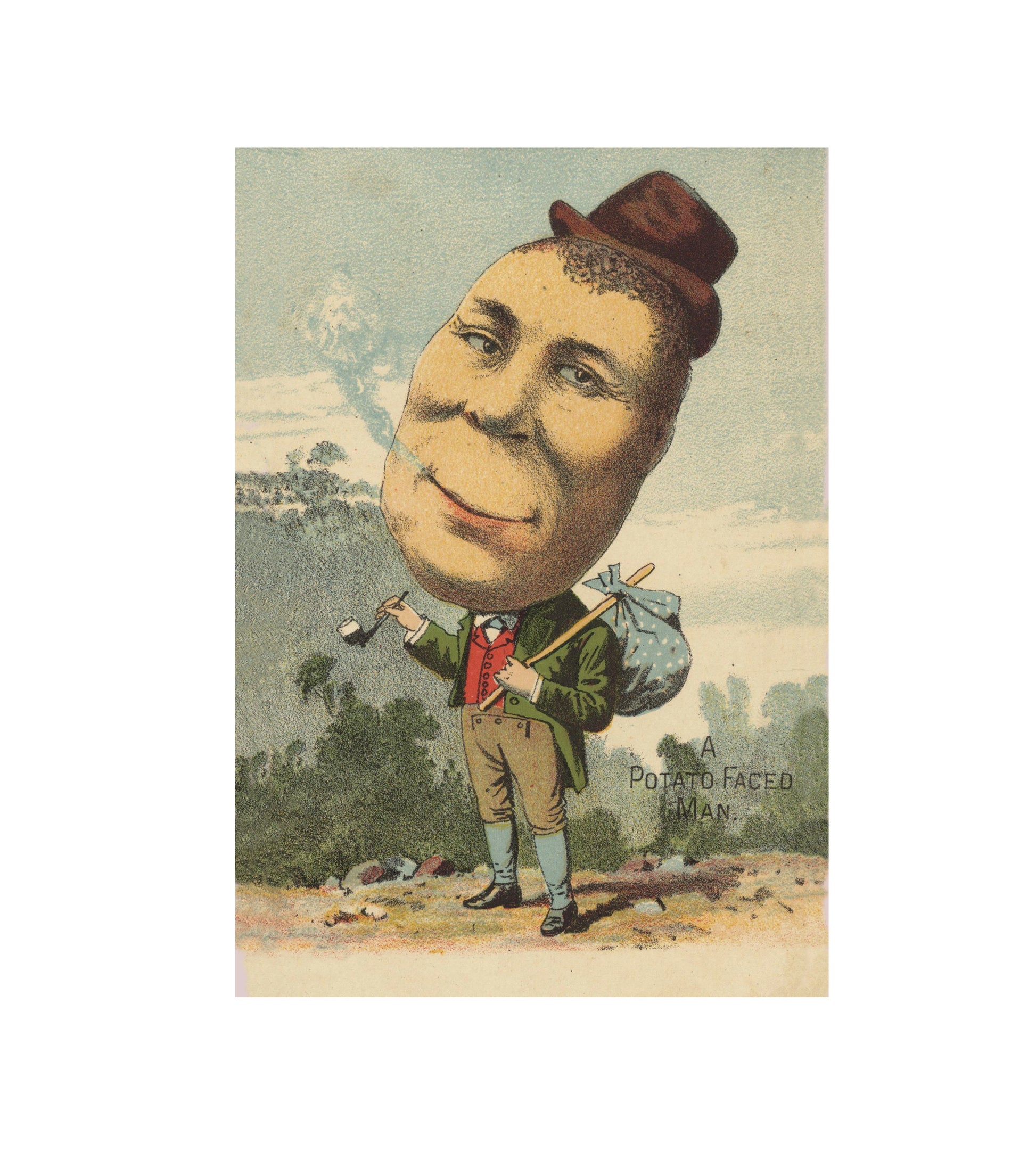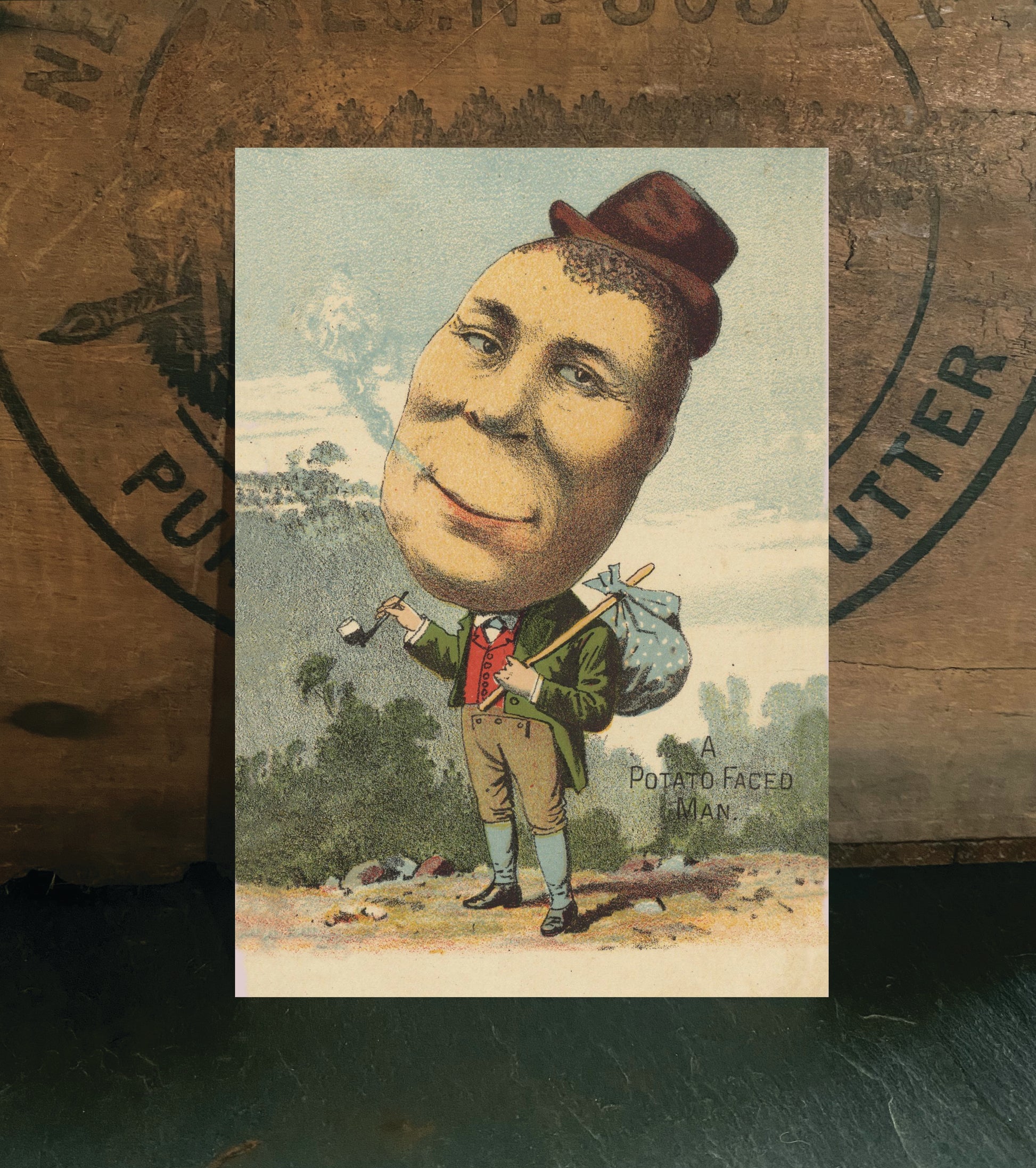 Trade cards were common in the 1800s, and often showed offbeat images that existed to build brand buzz. This is part of a collection we are working on of anthropomorphic vegetable people.